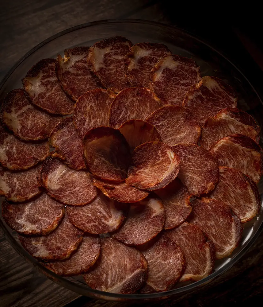 El Lomo Gran Reserva La Prudencia, se elabora de forma artesanal con el músculo ileoespinal del cerdo blanco. Escogido cuidadosamente de raza Duroc, grasos y grandes. Después nuestros maestros lo aderezan pasando por un minucioso proceso de curado-maduración de 6 meses en nuestras bodegas, dando lugar a piezas gran reserva únicas a degustar por los paladares más selectos.