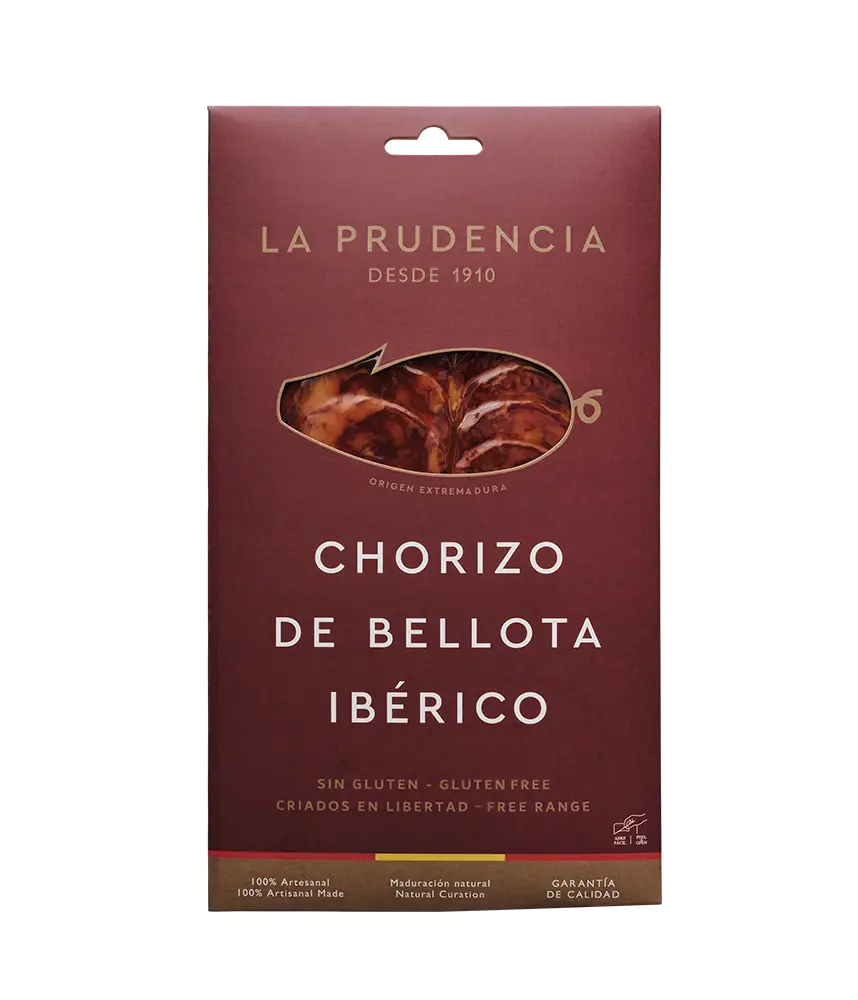 El Chorizo de Bellota Ibérico La Prudencia, se elabora basándonos la receta ancestral de nuestros abuelos, para recordar el sabor de pueblo. Mezcla de carnes picadas procentes de partes nobles del cerdo ibérico alimentado de bellota, aderezado, embuchado y curado en nuestros secaderos y bodegas naturales, durante 3 meses aproximadamente.
