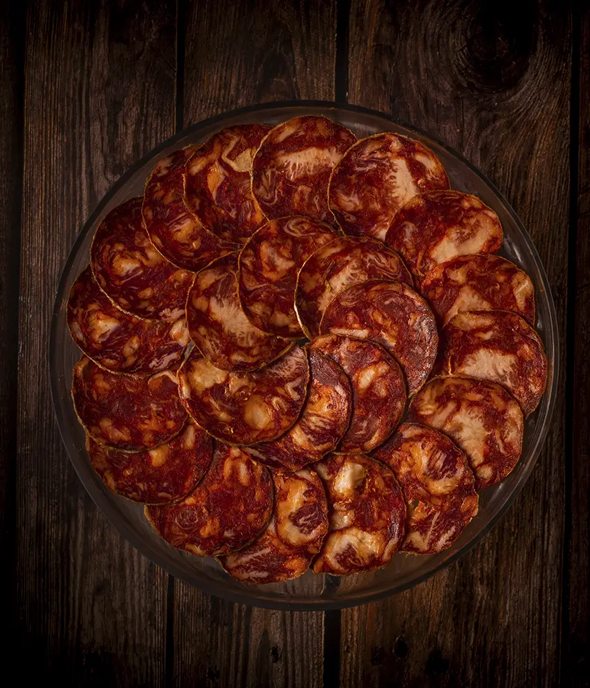 Al corte se caracteriza por su color rojo intenso, con infiltraciones de grasa brillante propia de los cerdos criados en libertad en la dehesa extremeña. Su sabor es intenso y jugoso con un equilibrado toque de pimentón.