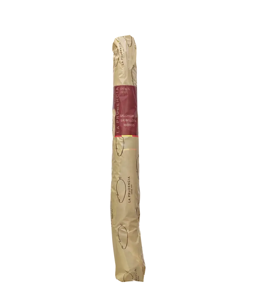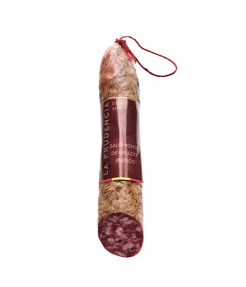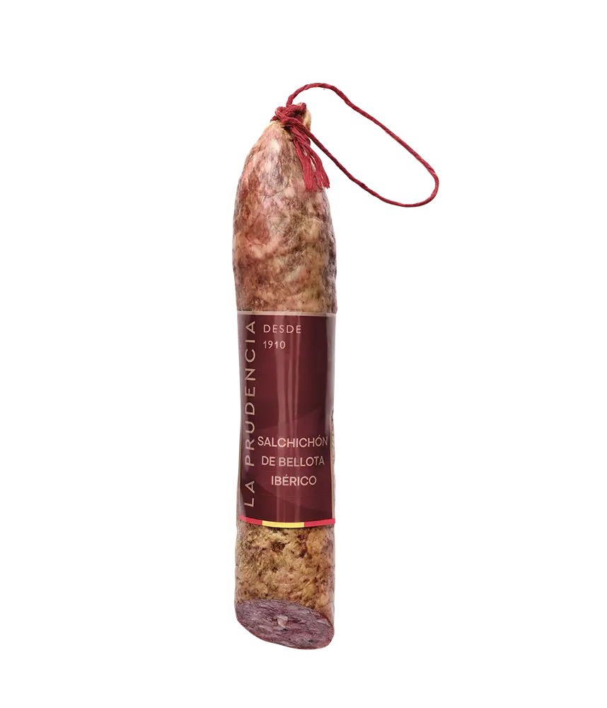 La Prudencia Bellota Iberian Salchichón is made based on the ancestral recipe of our grandparents, evocative of village flavours. Mixture of chopped meats from quality parts of the bellota Ibérico pig, seasoned, stuffed and cured in our natural dryers and storehouses, for approximately 4 months.