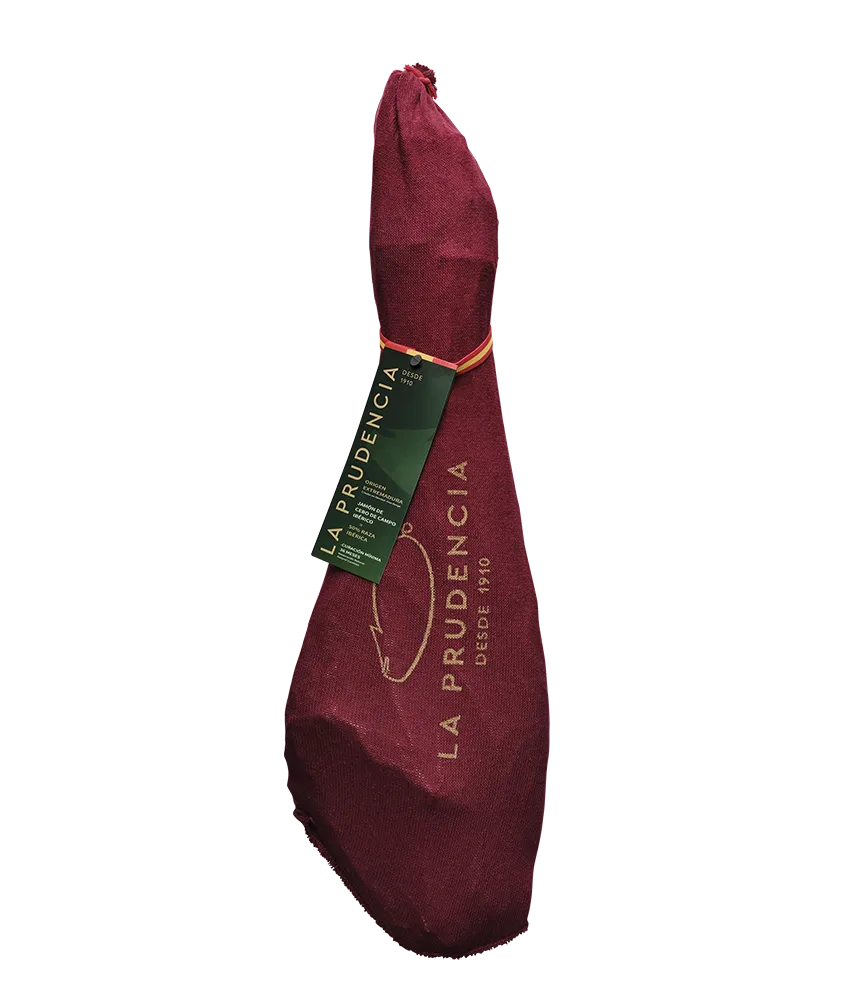 La Prudencia Iberian cebo de campo ham originates in Extremadura where the pig feeds on natural cereals, living free and in perfect harmony with nature, in a long-established area of Extremadura. The ham is cured in natural drying rooms and storehouses for more than 36 months using artisanal and traditional methods.