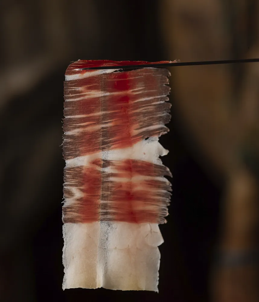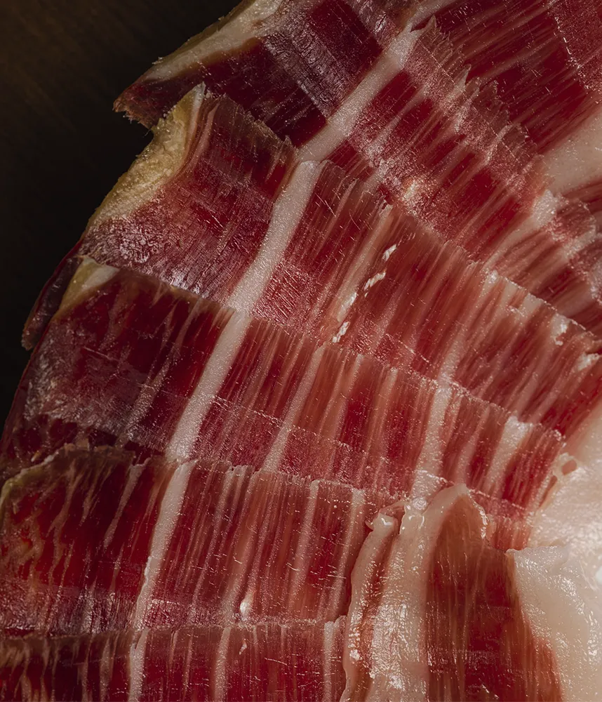 La Prudencia cebo de campo ham has a characteristic purple-red colour. It has a homogeneous pearly grain and a shiny fat. When cutting it, you can see small white crystals, called thyroxine crystals, typical of slow and natural curing. Mild and intense smell. Firm, juicy and homogeneous texture when cut. Its flavour is delicate, fine and sweet with a soft bouquet. Semi intense finish in the mouth that invites you to continue savouring it.