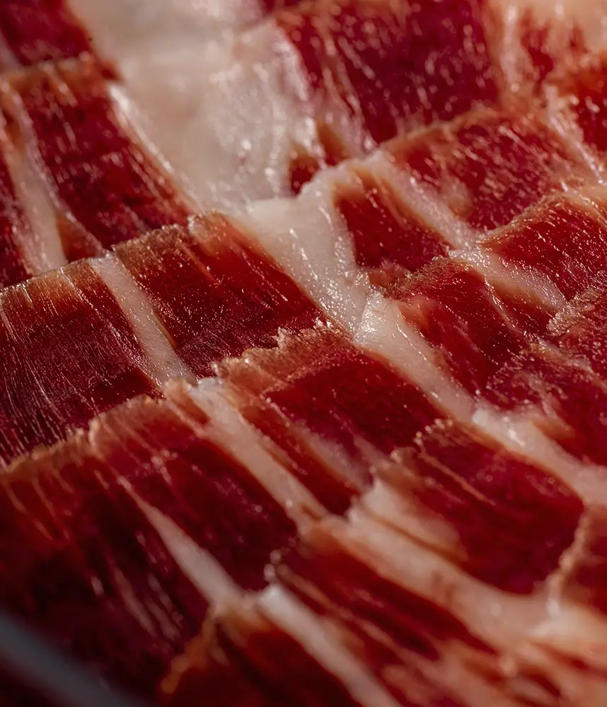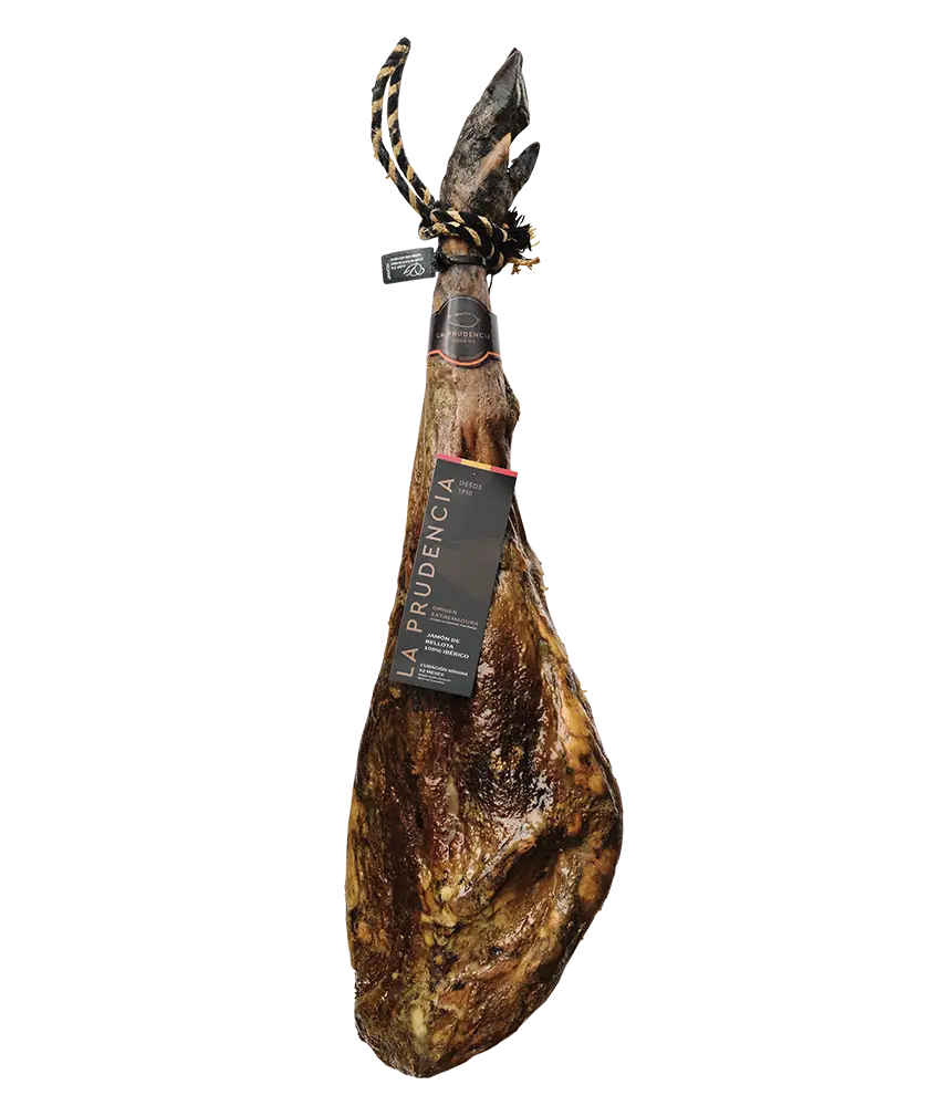 Jamón de bellota «pata negra» 100% Ibérico La Prudencia, procedente de cerdos 100% ibéricos criados en libertad en nuestras fincas extremeñas. Alimentados exclusivamente de bellotas proporcionadas por las encinas y alcornoques propios de una dehesa especial, un paraje único. Nuestros ejemplares de pura raza ibérica de bellota, son seleccionados cuidadosamente y tienen la garantía de excelencia de la etiqueta negra.