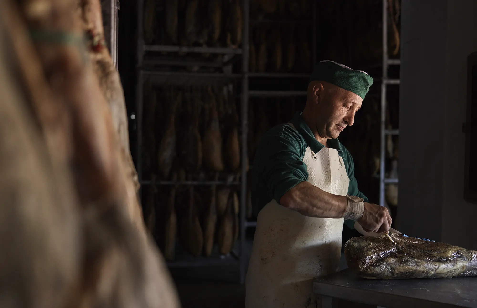 Al final del proceso de maduración se inicia una rigurosa fase de selección mediante la técnica tradicional del calado. Este procedimiento consiste en evaluar las características sensoriales de cada jamón y paleta.